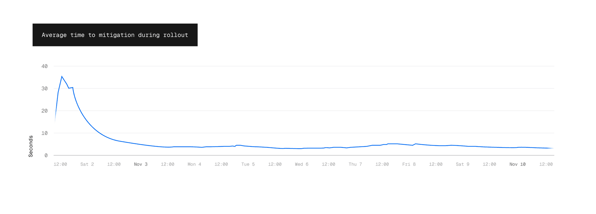 Since fully rolling out Protectd in January 2025, a process that began in November, every Vercel user now benefits from a significantly faster, more adaptive security infrastructure. The system consistently delivers a P99 time to mitigation of 3.5 seconds, a P50 of 2.5 seconds, and can respond to threats in as little as 0.5 seconds.