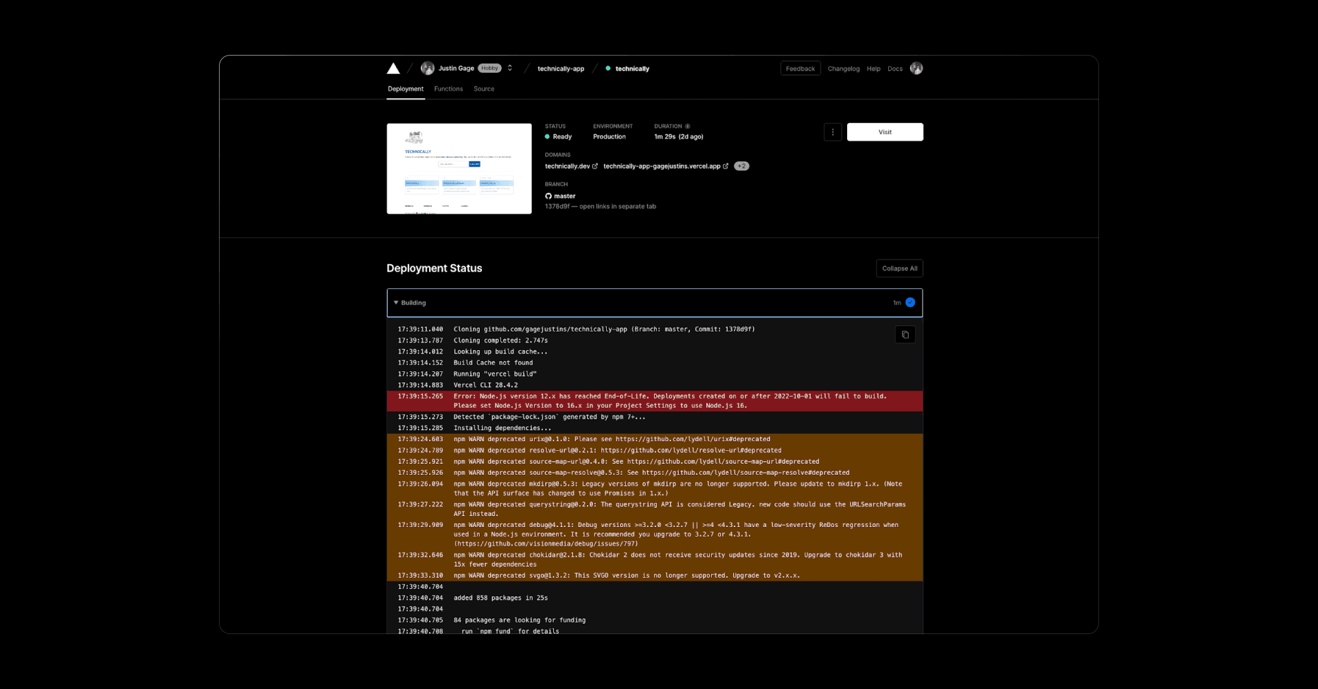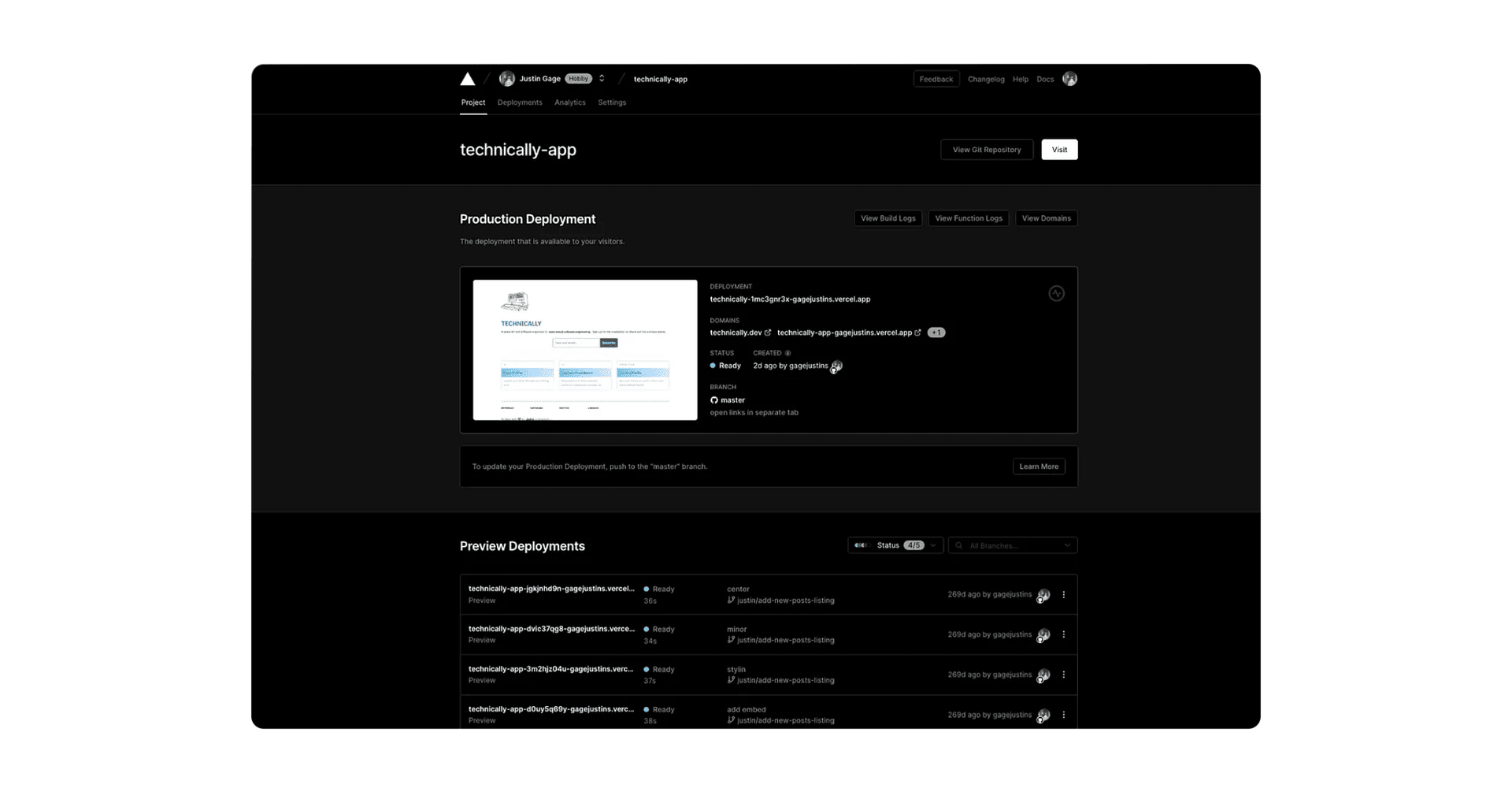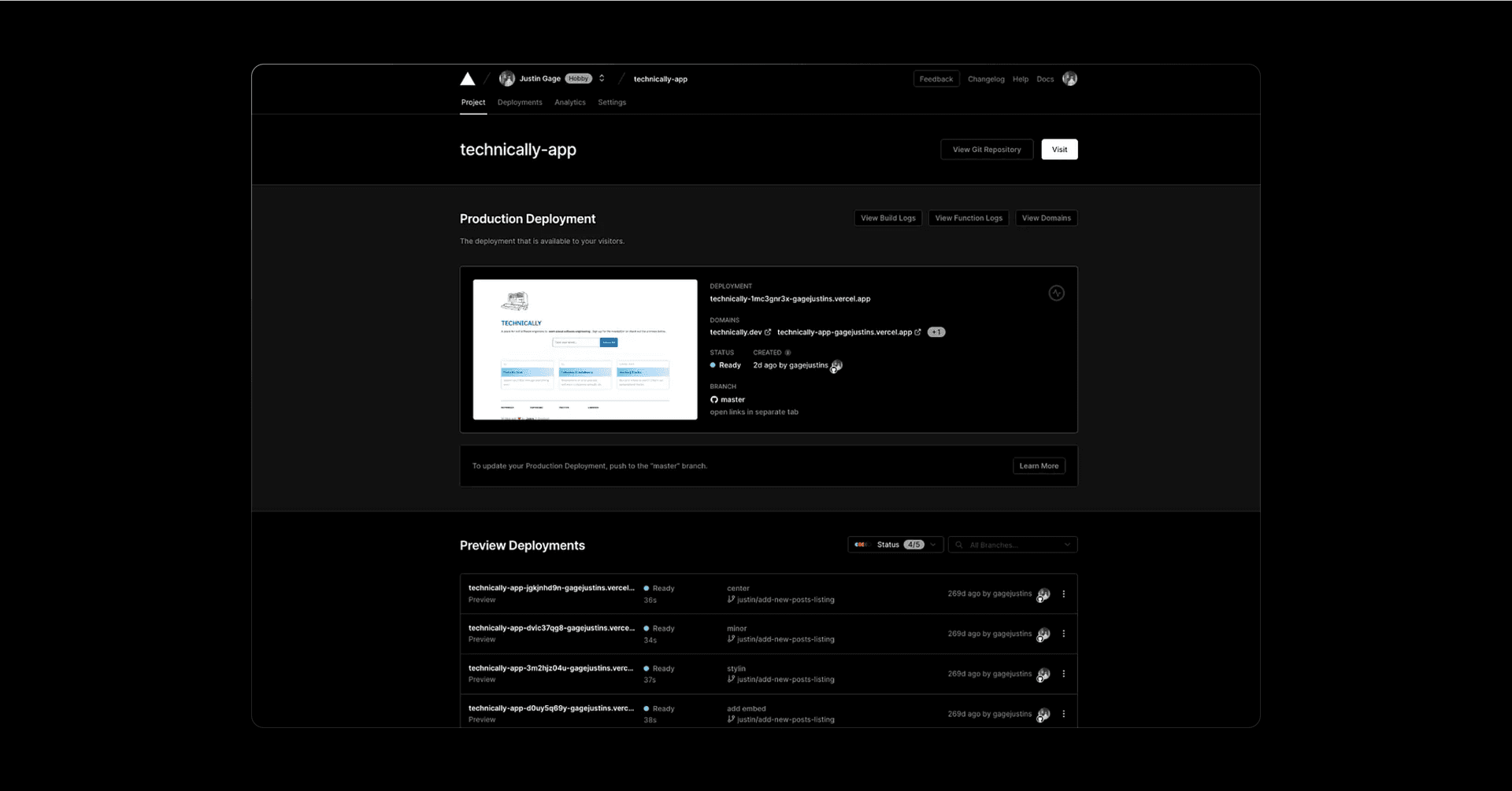 Finally, by default, Vercel assigns a random URL to your project so you can access it on the web right away. But you can easily add your own custom domains, like I’ve done here with technically.dev. Fun fact though, you can access an old version of the site at https://technically-app.vercel.app/