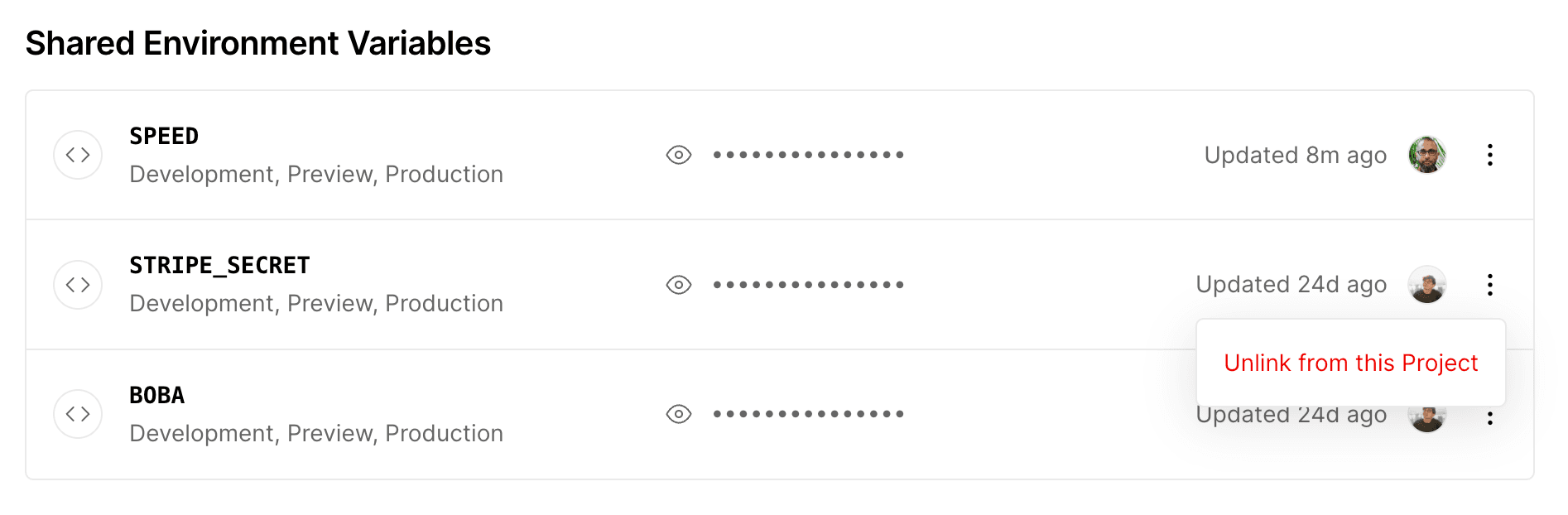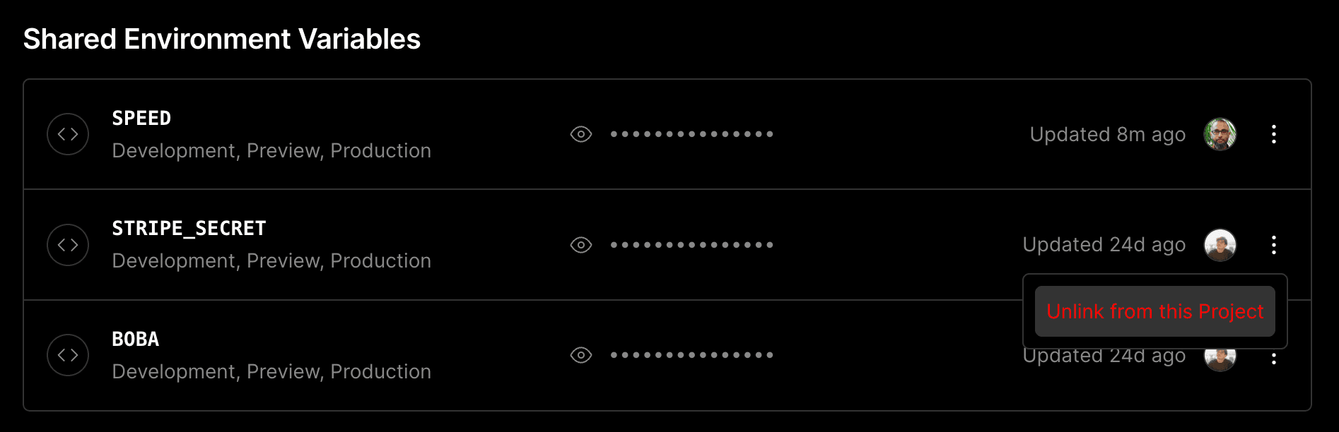 - Open the context menu for the specific shared environment variable you would like to unlink using the vertical ellipsis icon on the right hand side.