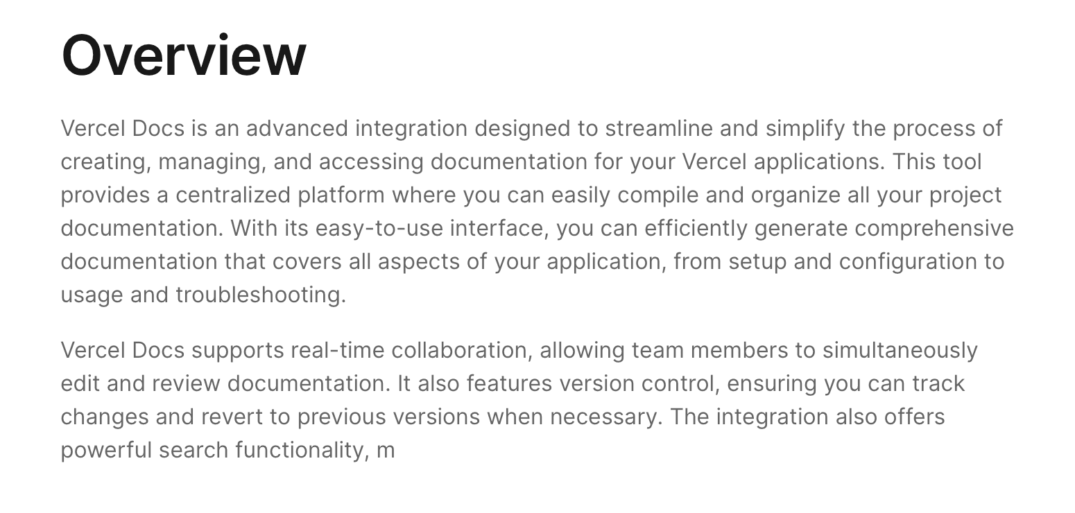You are recommended to include links to get started guides for using your product with specific frameworks. Once your product is added by a Vercel user, these links appear on the product's detail page of the user's Vercel dashboard.