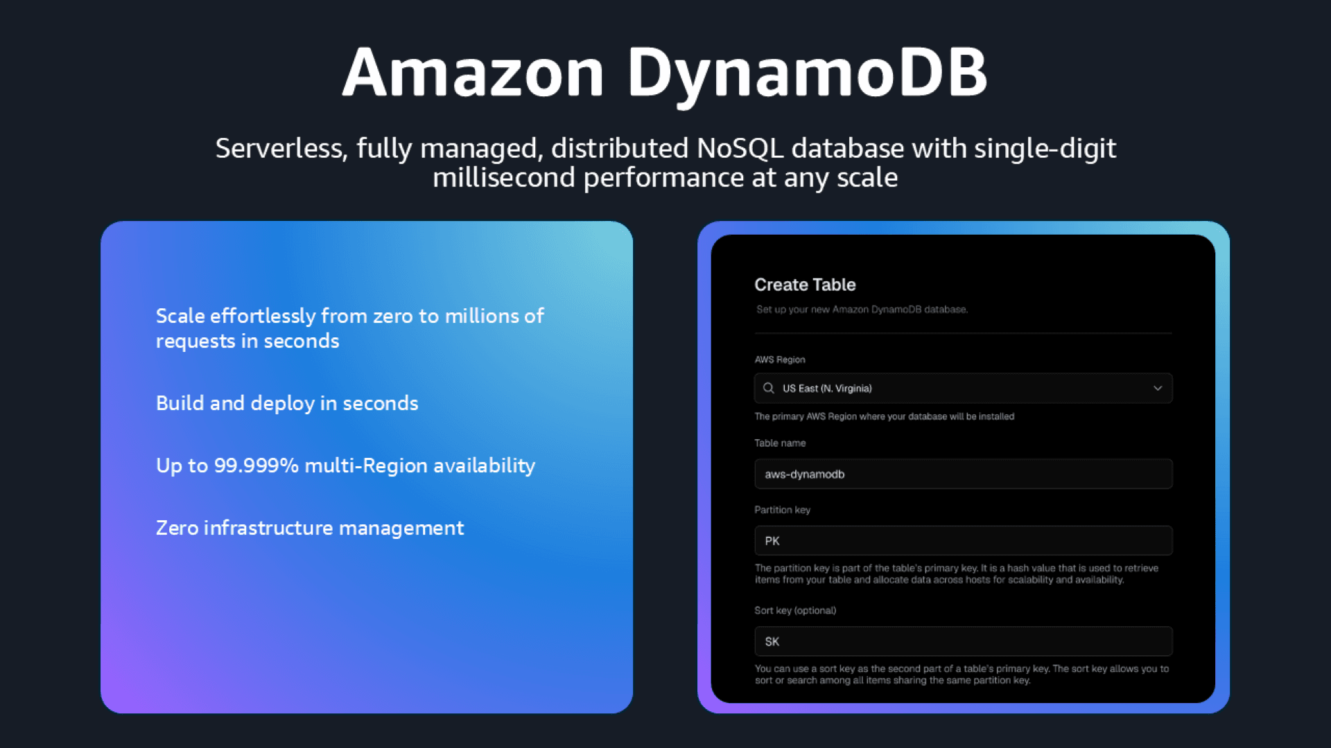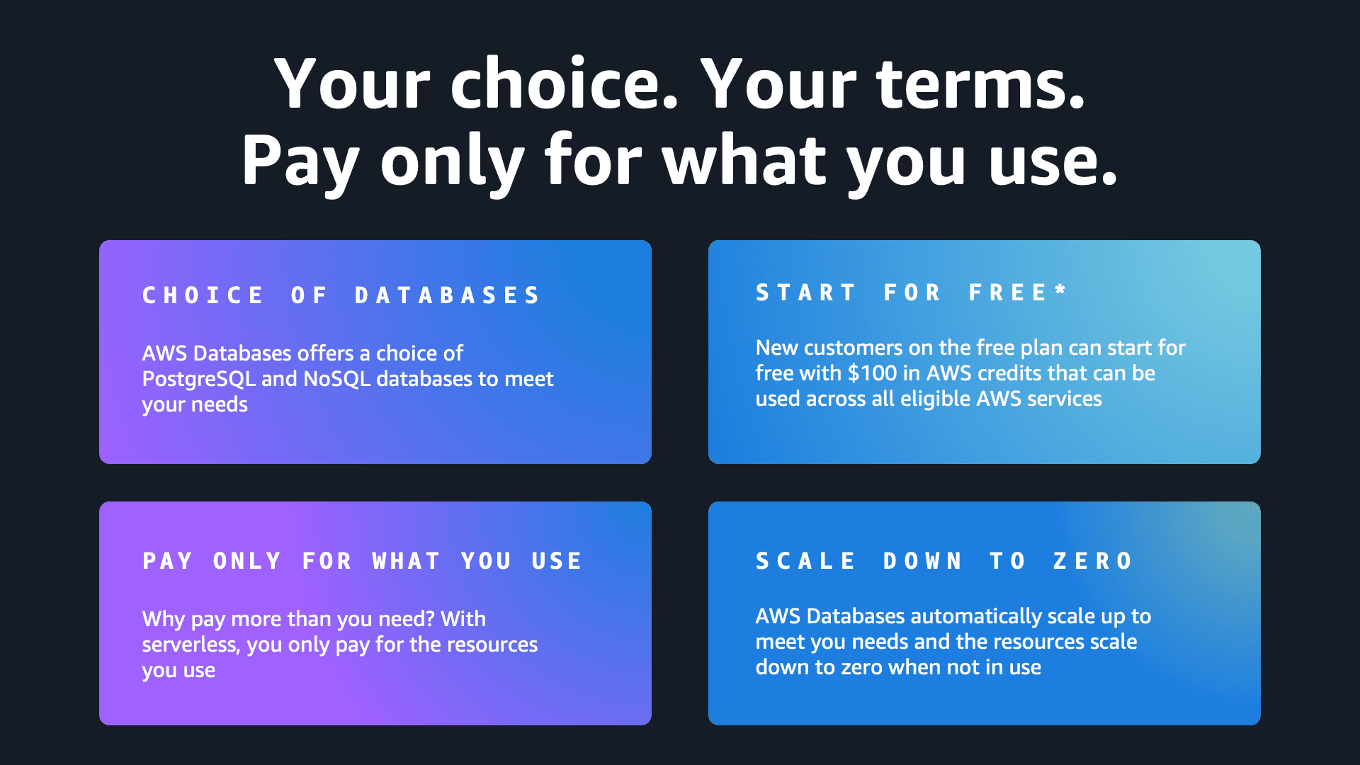 Build at the speed of an idea with AWS Databases. Create a new database in seconds and add features on-demand as your application grows. Focus on coding, not infrastructure management—our serverless, fully managed PostgreSQL and NoSQL databases automatically scale with your workload while you only pay for what you use. Whether you're prototyping your next big idea or powering production AI and data-driven applications, AWS Databases deliver the security, reliability, and price performance you need without the operational overhead.