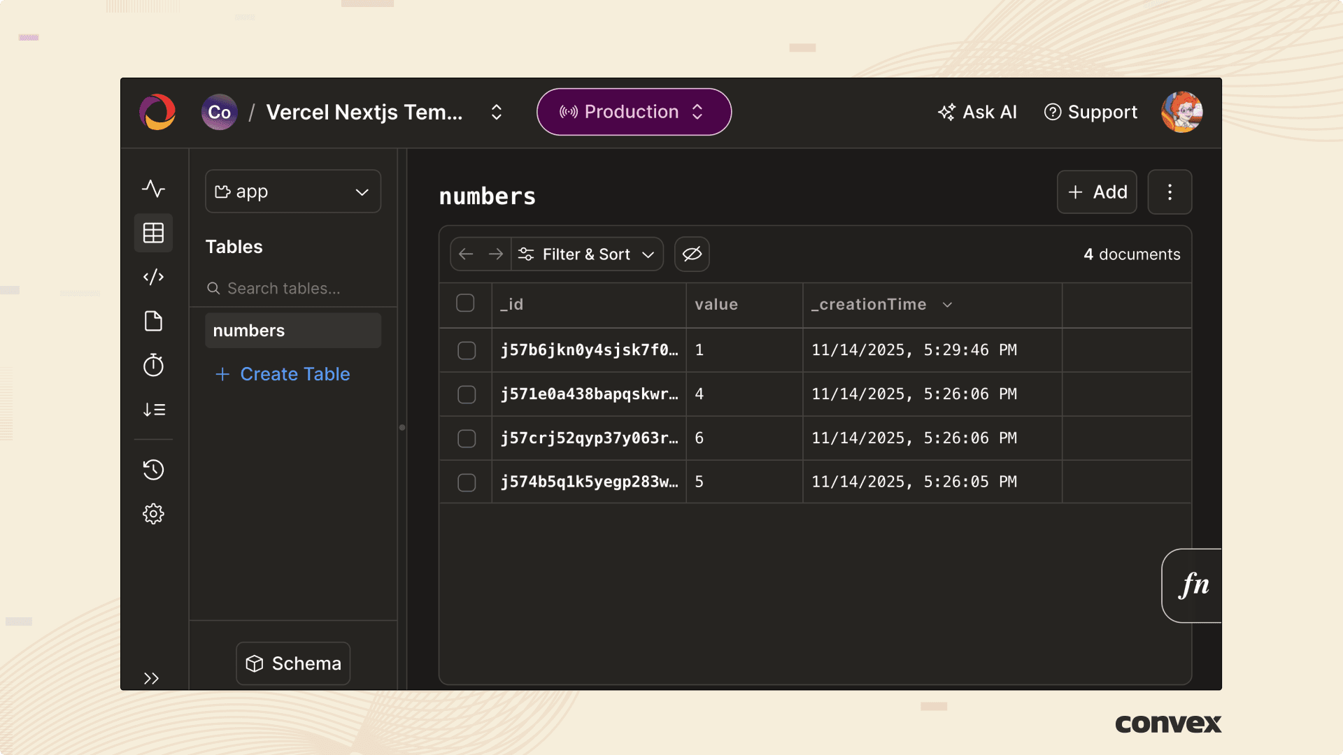 Convex Functions, Database, File Storage, Scheduling, and Search fit together cohesively. Everything in Convex is live and realtime.